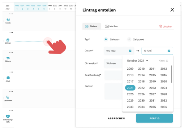 For visualising biographies, a new web-based programme was developed that allows for the multidimensional presentation of life events and phases, thus replacing the previous version of easyBiograph. The idea was for this new programme to enable the user-controlled enlargement of eventful life phases and the integration of images and photos. Further functions of the programme were determined within the framework of the participatory development process.